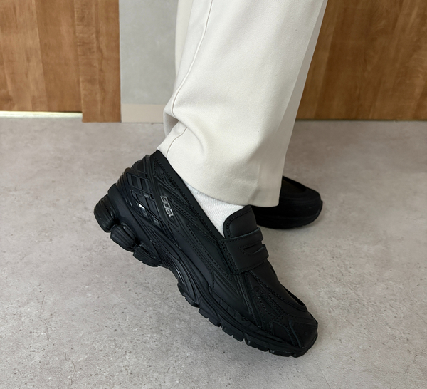 ブラックのレザーとスエードを組み合わせた上品なコンビデザイン。スリッポン感覚で履けるローファースタイルで、忙しい日でも手軽に着脱可能です。ニューバランスならではのクッション性とフィット感で快適な履き心地を実現。シンプルながら足元でしっかり存在感を放ち、カジュアルからビジネスカジュアルまで幅広くコーディネートできる万能モデルです。見え方も1番ローファーのモデル。