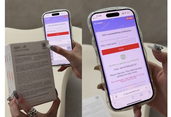 ラブブ正規品の外箱背面には光るホログラムシールが貼ってあり、中にシリアル番号とQRコードが隠れています。それをスマホで読み取ることで、POP MART公式サイトの「偽造防止検証」ページに飛ぶ仕様となっています。シールを削って出た番号を入力することで、本物かどうかを判定できます。つまり、QRのページが公式サイトでなかったり、シリアルが一致しなければ要注意となります!