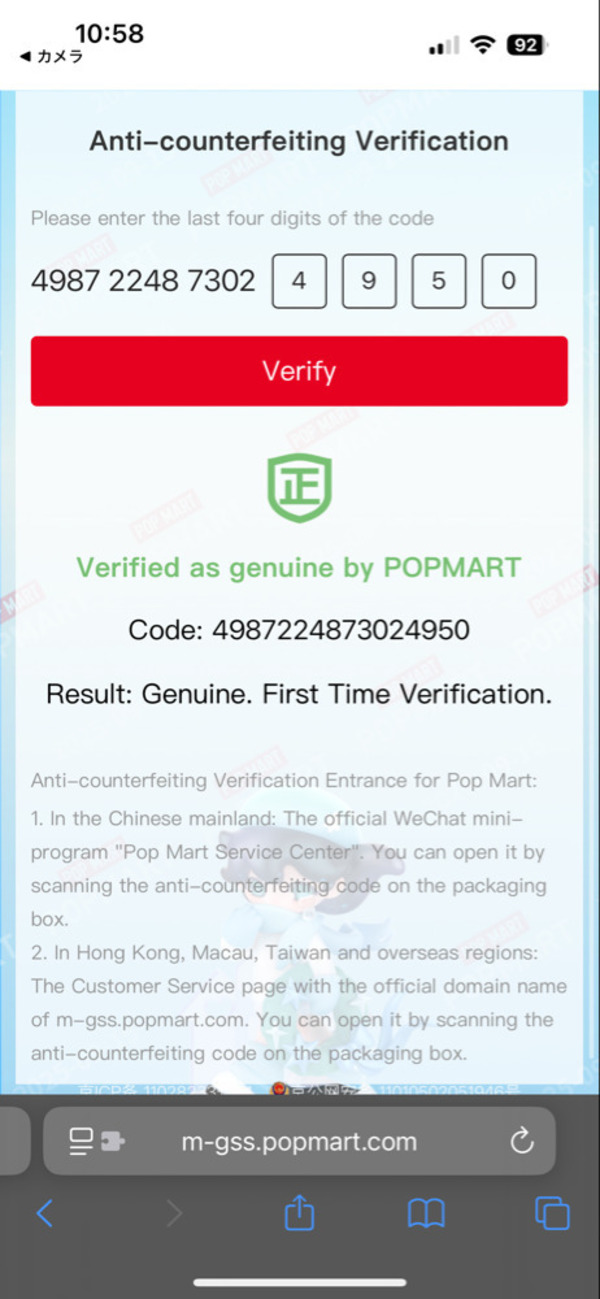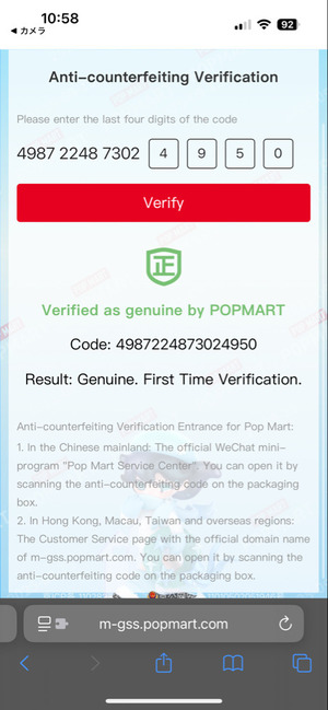 ラブブ正規品の外箱背面には光るホログラムシールが貼ってあり、中にシリアル番号とQRコードが隠れています。それをスマホで読み取ることで、POP MART公式サイトの「偽造防止検証」ページに飛ぶ仕様となっています。シールを削って出た番号を入力することで、本物かどうかを判定できます。つまり、QRのページが公式サイトでなかったり、シリアルが一致しなければ要注意となります!