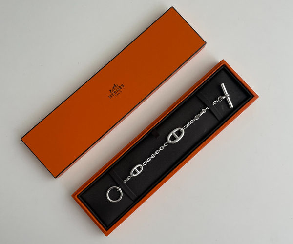 エルメスを代表するブレスレットの一つで、男女から愛されるアイコン的モデル。エルメスの頭文字である「H」をかたどった留め具が最大の特徴で、主張しすぎないボリューム感も上品です。