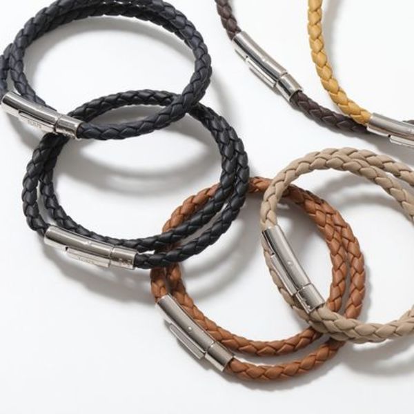 ナローバングル、コードブレス、レザーブレスなど素材の組み合わせを分けてもお洒落。またコードブレスで色味を差し、こなれ感をプラスするテクニックも有効です。アクセサリーが華奢な分「存在感」を抑える事ができ、さりげなさ・上品さはそのままに。