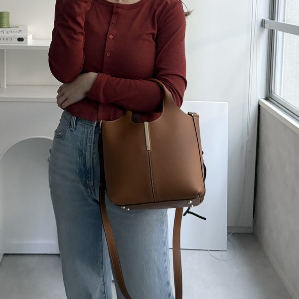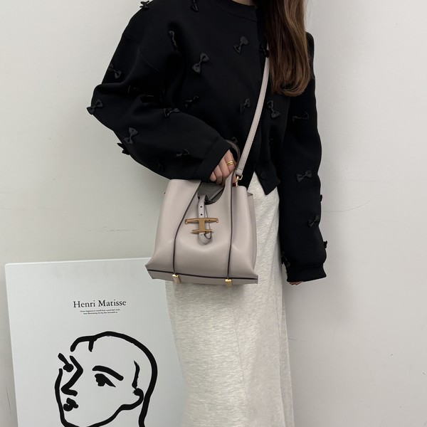 両サイドに仕切りのある「レザーバケットバッグ」は、500mlペットボトルや折り畳み傘を立てて収納できる万能アイテム。持ち手のデザインとTタイムレスのキーホルダーがシンプルなデザインのアクセントになっています。