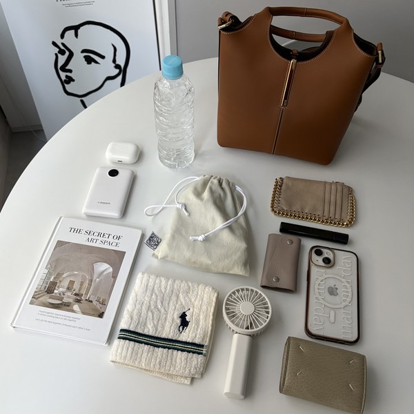 緩い開閉口のファスナーとたっぷりの収納ポケットで、見た目以上にザクザク入る「Bauletto Bag small」。柔らかいブラウンカラーなら、きれいめコーデにも合わせやすいです。