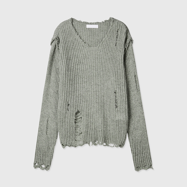 ハードなデストロイ加工が施されたホーリーインコードのVネックニットです。グランジスタイルやY2Kスタイルに最適な逸品。