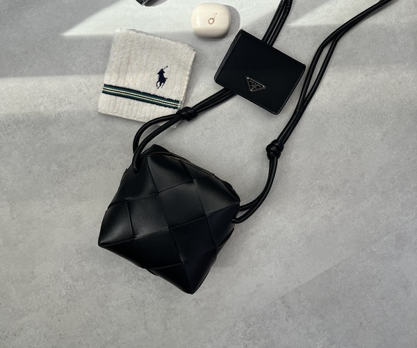 ボッテガ定番のカセット型をナイロン素材で再構築。パデッド(キルティング調)加工により立体感が生まれ、軽さと高級感を両立。