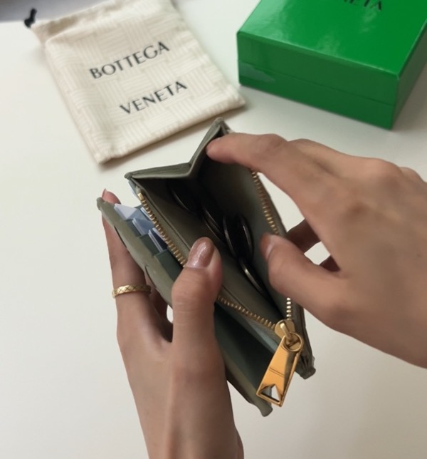 ∟ボッテガヴェネタで、特に人気なのは「イントレチャート スモール 二つ折りウォレット」。こちらはちょっと渋みのある落ち着いたオリーブグリーンのカラーに、中がちょっとブルーがかった色味を持つバイカラータイプ。ボッテがのお財布はニュアンスカラーが多いので、大人の女性におすすめなんです!