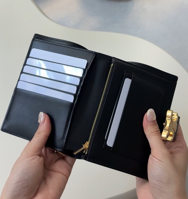 ∟セリーヌでずっと売れている定番モデルがこちらの「ミディアム ストラップ ウォレット」。こちらは、トリオンフがアクセントになっている2つ折りのタイプのお財布で、サイズ感としてはミニ財布というよりかはミディアムサイズぐらいの大きさ。そのため、ミニ財布と長財布のいいとこ取りをしたようなモデルとなっています!