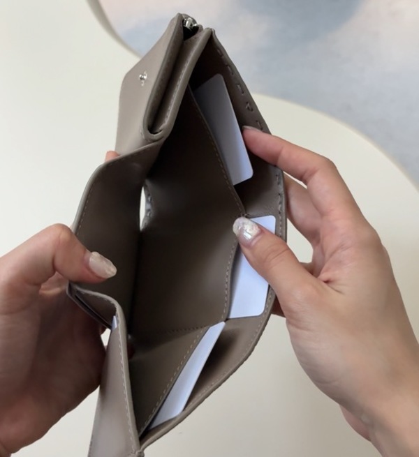 スナップボタンを開けると、内側は上品なグレージュカラーに。一面フラットな状態にカードスロットが縦に2つずつで、合計6つほどついています。カードは縦型のため、出し入れもスムーズに行うことができます。