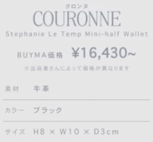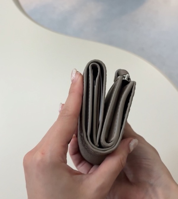 ∟最後にご紹介するのは、手頃な価格でかつ現金もカードもしっかり入るミニ財布が欲しいという方におすめなクロンヌという韓国ブランドのお財布。シボ感のあるレザーとスムースレザーのコントラストが美しく、デザインがすごくおしゃれです。あとはこの中央のゴールドメタルがエレガントな印象を放ちます。
