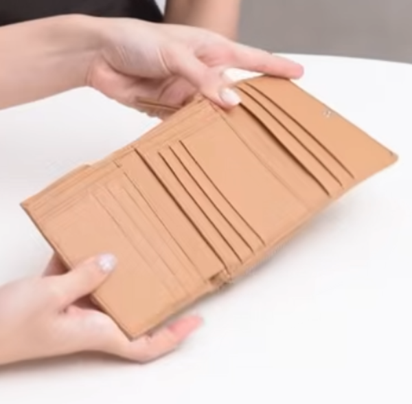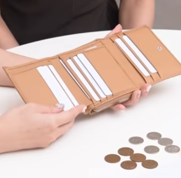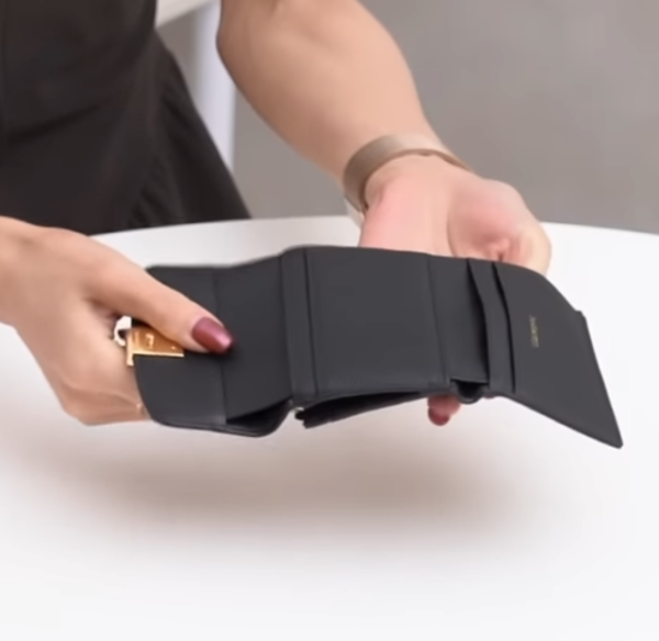 こんなにコンパクトならが3つ折りタイプで、特徴は小銭入れがL字型になっているところ。3つ折りタイプのお財布でここまで小銭入れがしっかりしているのは珍しいと言えます。中を開けるとカードスロットが4つ。そして紙幣入れの部分にも、3つのカードスロットを完備しています。