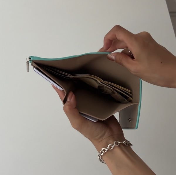 こちらは2つ折りのタイプで、スナップボタンで開けるとカードスロットが6つあります。作りは本当にシンプルですが、ノットのようなデザインのジッパーが、心くすぐるティティールとなっています!