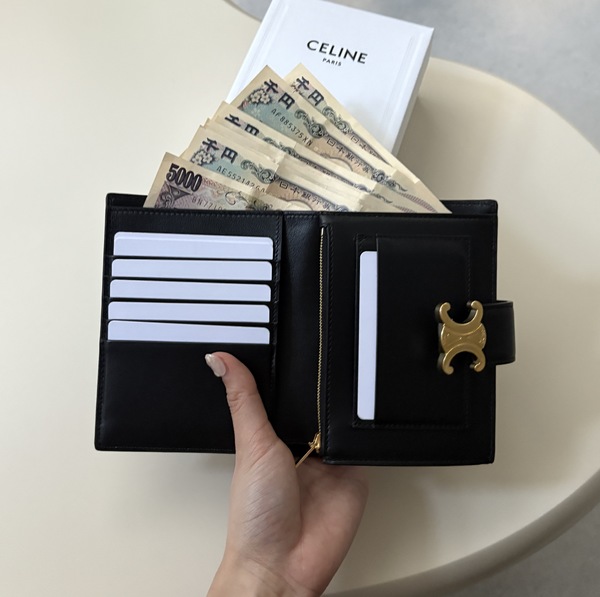 スナップボタンを開けていただくと、縦にカードスロットが5つ。そして広めのオープンポケットがサイドに1つずつ付いています。また小銭入れは、片側に少しだけマチがついているタイプで、セリーヌの財布の中でも、少し特殊な仕様となっています。