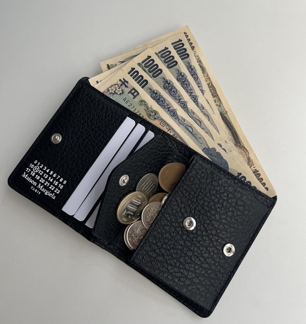 ☑︎カード:10枚 ☑︎紙幣:5枚 ☑︎コイン:10枚 お札は2つ折りにした状態で入れると少しはみ出るぐらい。この状態でフラップを閉じることはできますが数mm程度、ちょっと紙が折れ曲がってしまうので気になる方は3つ折りにして入れていただくといいと思います。