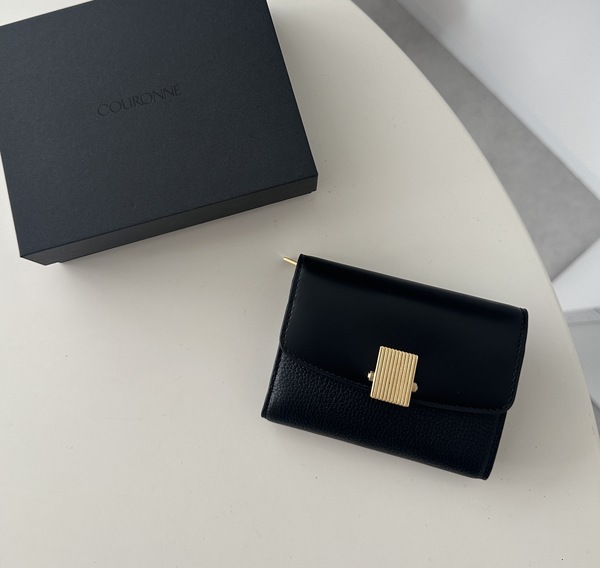 ∟最後にご紹介するのは、手頃な価格でかつ現金もカードもしっかり入るミニ財布が欲しいという方におすめなクロンヌという韓国ブランドのお財布。シボ感のあるレザーとスムースレザーのコントラストが美しく、デザインがすごくおしゃれです。あとはこの中央のゴールドメタルがエレガントな印象を放ちます。
