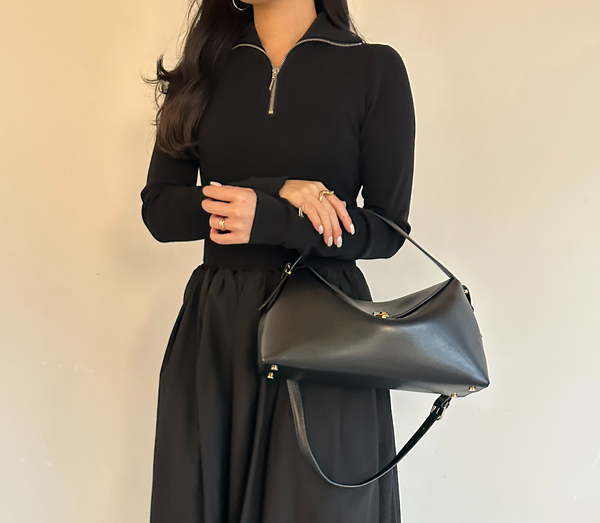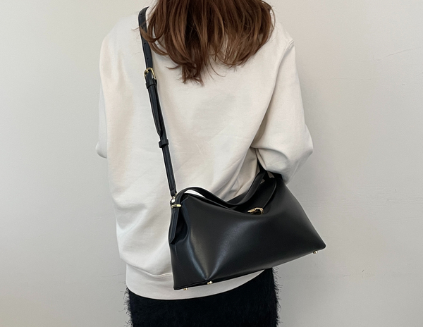 クラッチとして持つと、バッグのシャープなラインが際立ち、ぐっとスタイリッシュな印象に。ミニマルな装いも一気にモードへと引き締まります。フォーマルな場面にもぴったりで、上品さをプラスしてくれます。