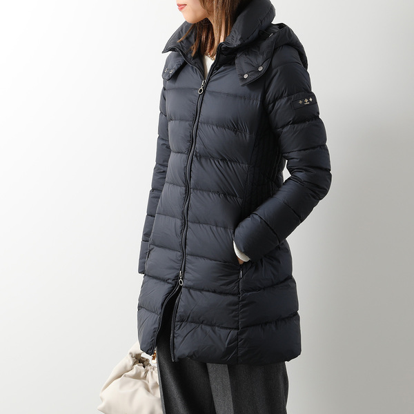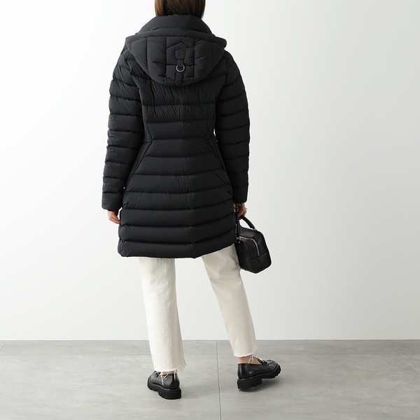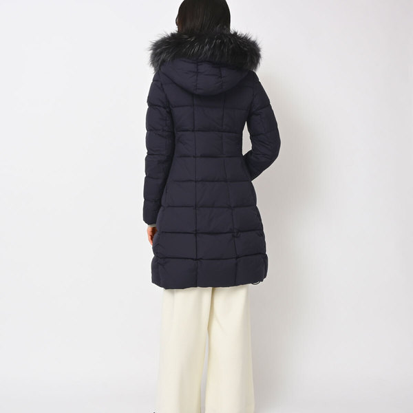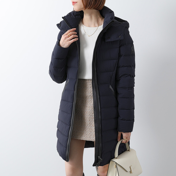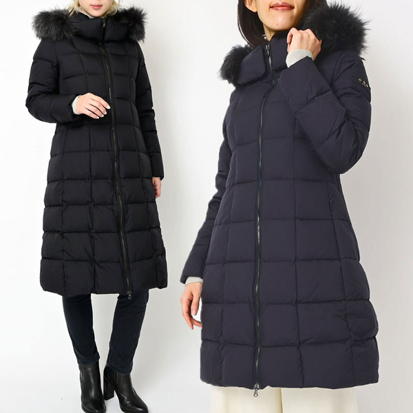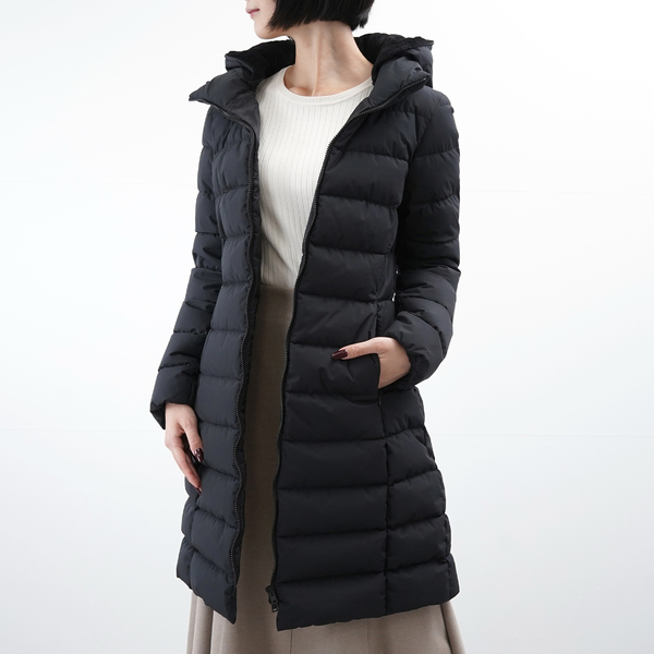女性らしいフィット&フレアのシルエットがクラス感のあるロングダウン。引き出し式フードが実用性を高めています。