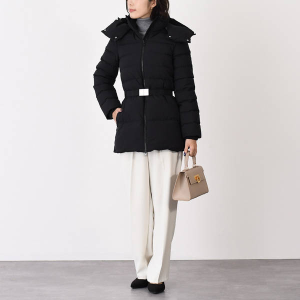 体のラインを覆い隠すボリューミーなアウターは重たい印象を与えてしまいがち。そんなダウンをスッキリ見せるには、ウエストにシェイプのあるXラインのシルエットやメリハリを出せるベルトマークのデザインがおすすめです。