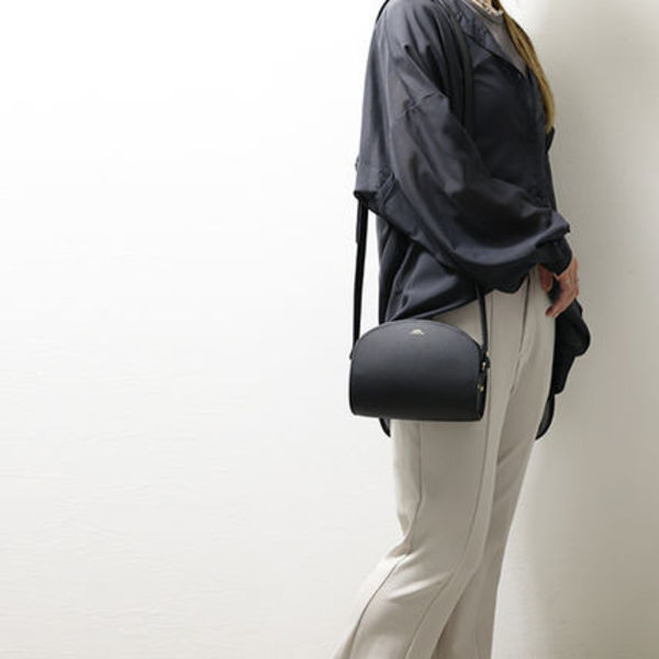 カーフレザーを使ったシンプルなミニサイズのハーフムーンバッグ。型崩れしづらく必要最低限の荷物がすっぽり入るサイズ感なので、1つあるとお出かけシーンに重宝します。