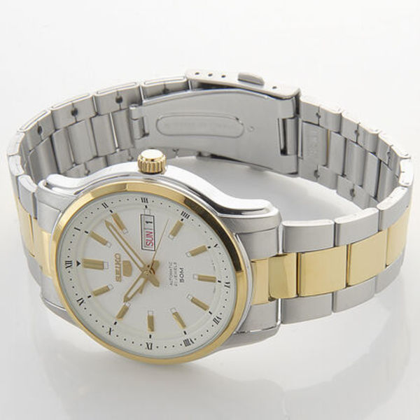日本を代表する腕時計ブランドSEIKO(セイコー)。自動巻きの「セイコー5」は、日常生活防水を搭載しているので、気兼ねなく取り入れられるところもポイント!ホワイトの文字盤とベルトにゴールドのラインがアクセントになっています。