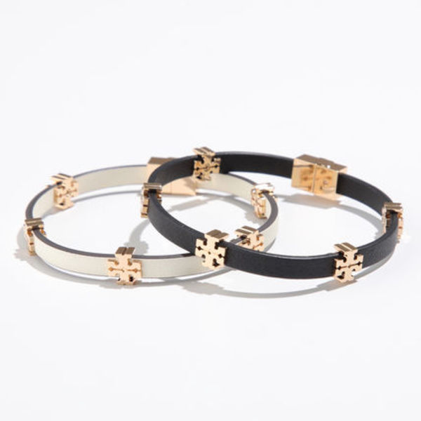 代替レザー×リサイクルブラスで丈夫さを実現したTory Burch(トリーバーチ)のブレスレット。ダブルTを全面にあしらいどの角度から見てもラグジュアリーです。絶妙な太さで腕時計との重ね付けにも最適ですよ!