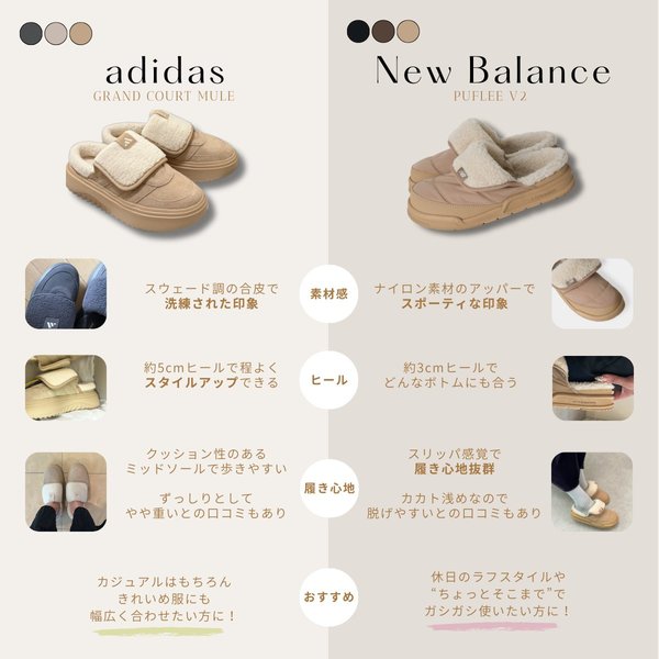 なかでも今注目されているのが、デザイン性と履きやすさを兼ね備えたadidas「グランドコートミュール」、ニューバランス「PUFLEE V2」!見た目重視で選ぶ?それとも履き心地?と迷ってしまう方も多いはず。