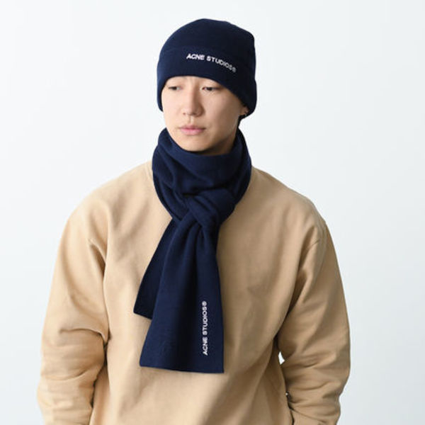 人気のマフラーブランドといえばAcne Studios(アクネストゥディオス)。ウール混の素材なら、保温性も高くて実用的。シンプルなブランドロゴ刺繍がコントラストになって映えます。ベーシックなデザインだから、オンオフ問わず大活躍間違いなしです。