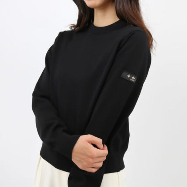 TATRAS(タトラス)からおすすめしたいのは、クルーネックのベーシックなニット。コットンとポリエステルを使っているので、チクチクしづらくお手入れもラクチンです。タトラスらしく、腕にロゴを配しているところもポイント!