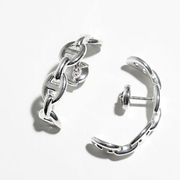 ∟「錨の鎖」をモチーフにしたエルメスの名品中の名品「シェーヌダンクル」。繊細なラインながらも存在感がありエルメスらしさをアピールできます。フープのように曲線的になっているので、カジュアルにもきれいめにも合わせやすいところが◎