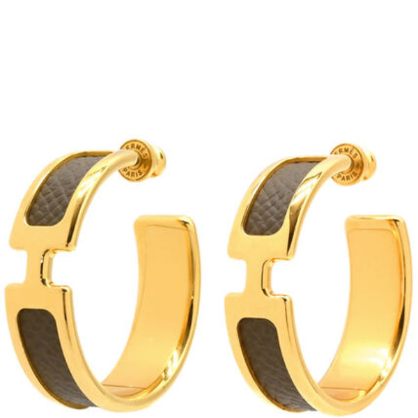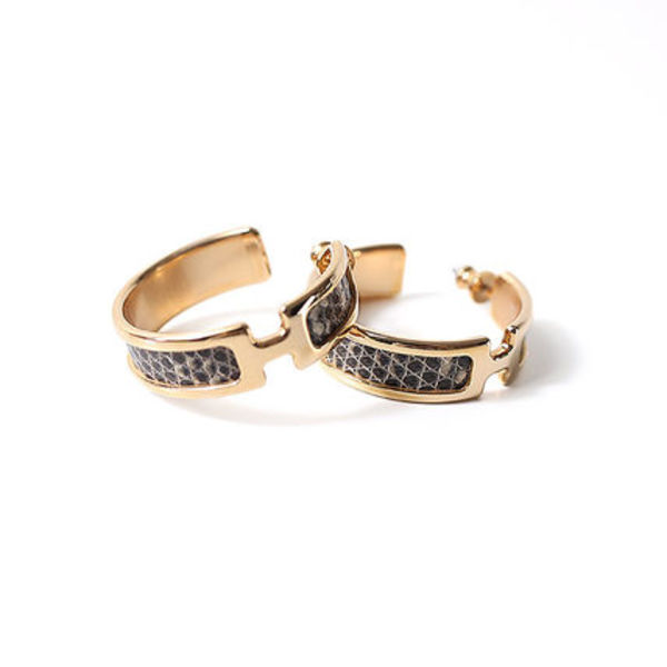 ∟雄仔牛の革に細かい型押しを施したエルメスらしい「ヴォー・エプソン」と呼ばれる素材を使ったピアス。「H」ロゴのメタルパーツとのコントラストがとにかくラグジュアリーで、トレンドに流されず長くずっと使えます。
