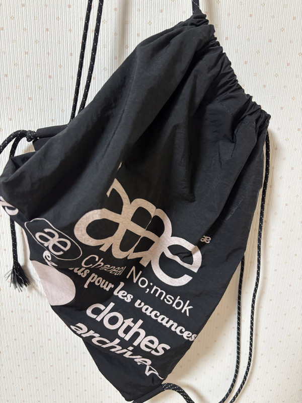文字もっと白いとおもってたけど灰色でした!ナイロンって感じの薄い素材ではあるけどサイズ感も紐の長さもちょうどよかったです。