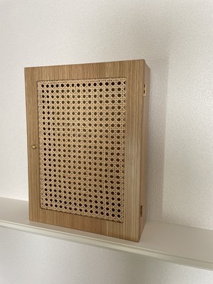 └― 韓国でも人気が高まっているラタン素材のボックスタイプ。中には用途に合わせて位置を調節することができるガラスの仕切り板が付属しているほか、壁かけ用のフックが裏面に備わっているので場所を問わずウォールデコレーションとしても活躍してくれる優れものです。(横30cm × 縦40cm × 奥行き9cm / 内寸7cm)