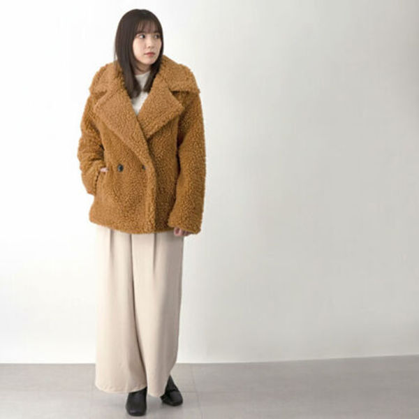 上質なムートンコートを探している方におすすめなのがUGG(アグ)。モコモコとしたボア素材と柔らかいブラウンカラーがトレンドライク♡大きなダブルブレスト仕様で、小顔効果抜群です。
