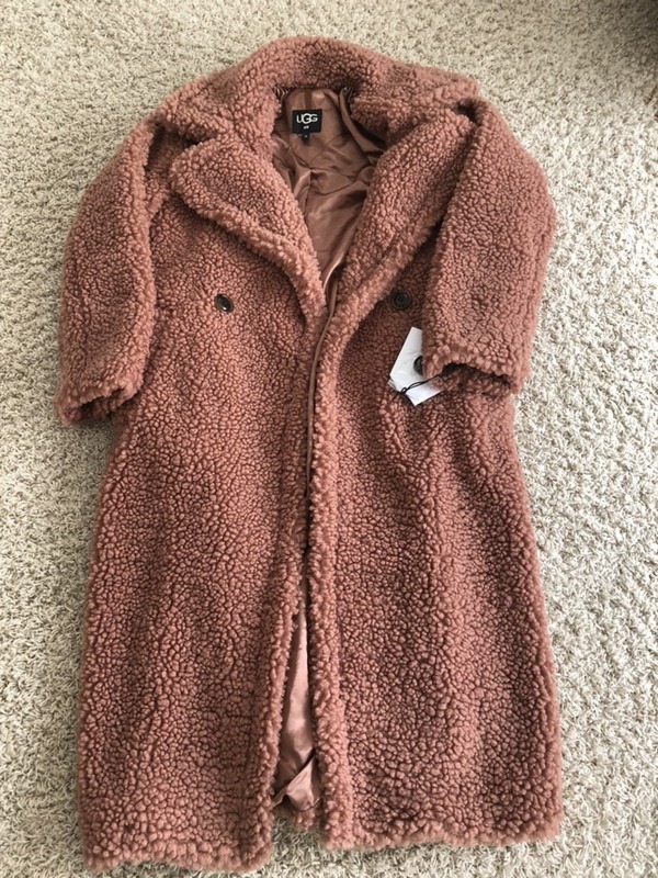 上質なムートンコートを探している方におすすめなのがUGG(アグ)。モコモコとしたボア素材と柔らかいブラウンカラーがトレンドライク♡大きなダブルブレスト仕様で、小顔効果抜群です。
