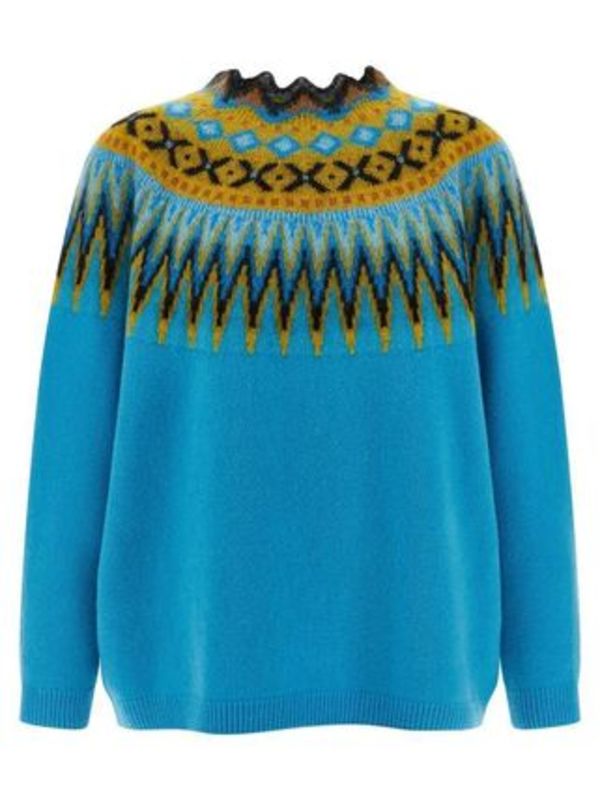 鮮やかなブルーのボディに黄色を基調としたノルディック柄が映えるロエベのニットです。モヘアブレンドなので保温性も抜群。1枚でサマになるニットです。