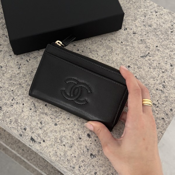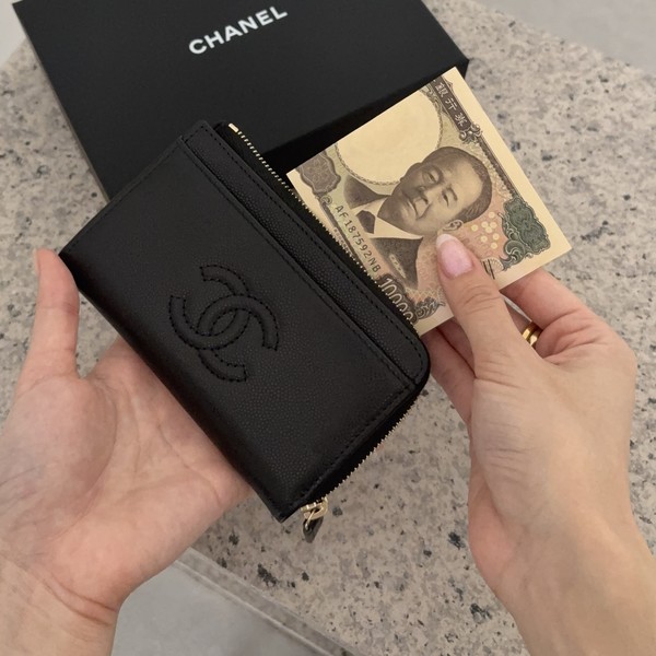 復刻ロゴが可愛いCHANEL(シャネル)のフラグメントケースが堂々の1位!!手のひらサイズで、ステッチのロゴが上品♡L字ジップとお札が二つ折りで入るサイズ感が使いやすいポイントとなっています。