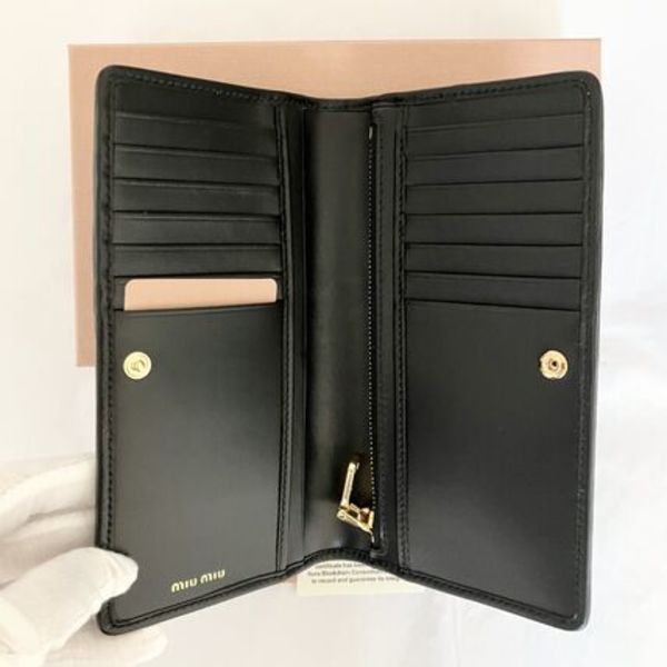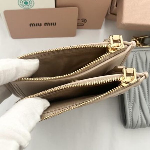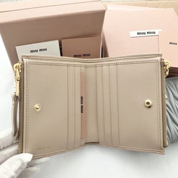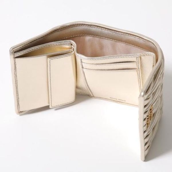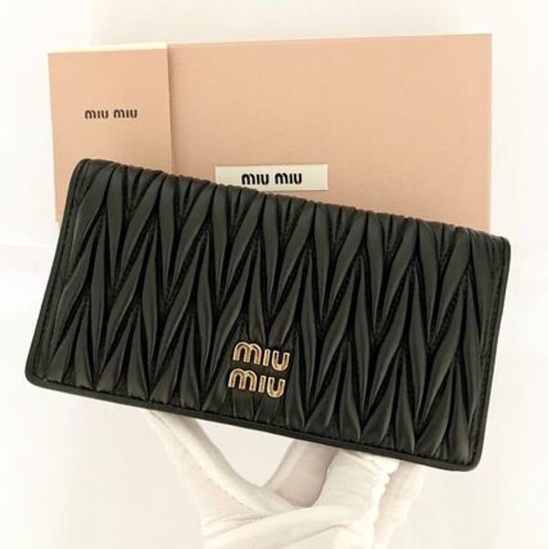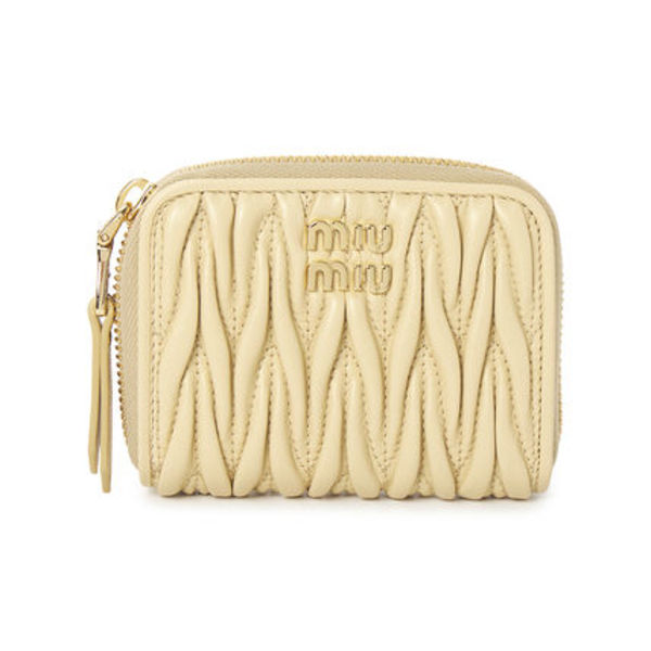 ミュウミュウを象徴する、ふっくらとした立体的なキルティング加工(マトラッセ)が施されている財布。ラムスキン特有の柔らかい質感と、華やかでフェミニンな印象が魅力です。