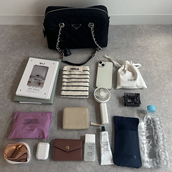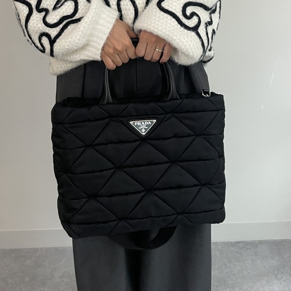 プラダといえば、再生ナイロンを使った「リナイロン」シリーズ。ぷっくり立体感のあるパデッド素材のトートバッグは、今年らしいモードな雰囲気です。持ち手は短めですが、太めのショルダーストラップ付で、斜め掛けやアウターの上からも肩掛けしやすいですよ。