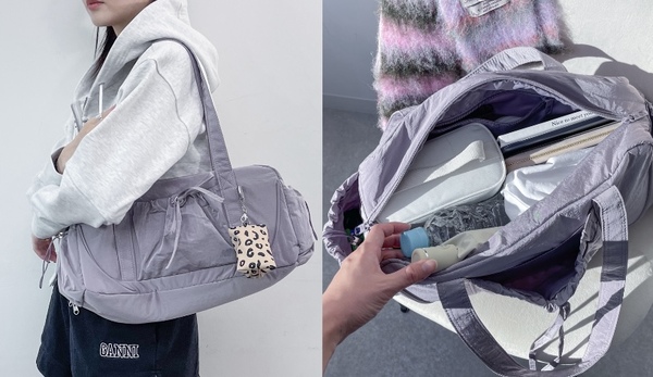 ほんのり光沢感のあるナイロン製のダッフルバッグはリボンの飾りが愛らしい人気デザインで、外側のポケットが大充実していたりと決して見掛け倒しではない実用的な仕様も◎。バイオレットやシルバーなど洗練されたカラーバリエーションが展開されていて、軽量かつ収納力も高いのでジム通いや小旅行にもうってつけです。
