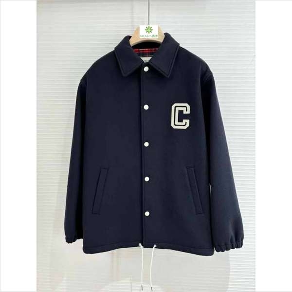 胸元に"C"プリント、バックに"CELINE PARIS"プリントがあしらわれたセリーヌのコーチジャケットです。ウール素材なので柔らかな印象。スポーティー過ぎない点も大きな魅力です。