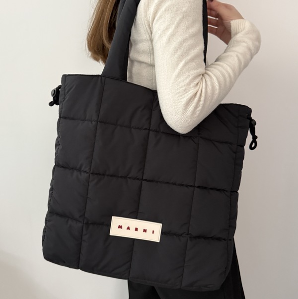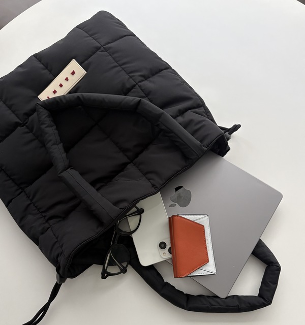 MARNI(マルニ)の「ブラック Puff トートバッグ」は、軽量なナイロン素材と柔らかな中綿のシルエットが特徴で、デイリー使いに最適な逸品。サイズもビッグ仕様で14インチのPCも楽々に収納できちゃいます!ふかふかなナイロンを使用しているため、PCケースも不要だから使い勝手は想像以上かも。