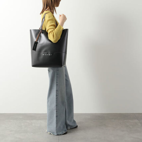 MARNI(マルニ)のトートバッグは、丈夫で汚れがつきにくいPVCを使用。ブランドロゴが控えめなので、カジュアルながらも通勤バッグにもぴったり。A4サイズが収まる大容量サイズで、荷物が多い方も安心です。