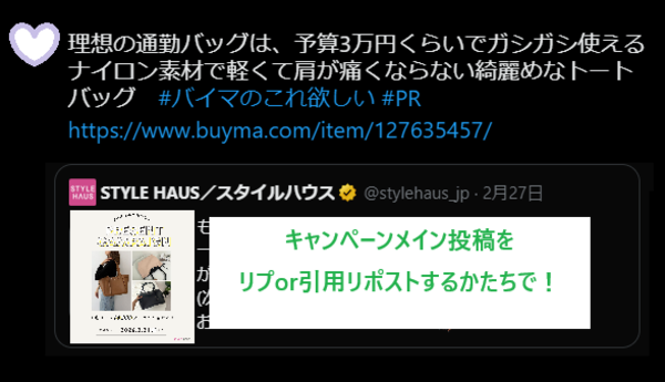 本キャンペーンは、海外通販バイマの姉妹メディア"STYLE HAUS(スタイルハウス)"の公式Xアカウントにて開催します。