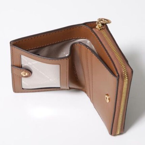 ラウンドジップタイプの二つ折り財布は、中身がスッキリまとまるので安心。アイコニックなMKロゴががあしらわれ、上質な存在感を放っています。L字ファスナー開閉タイプの小銭入れがついているため、決済時も楽々です。