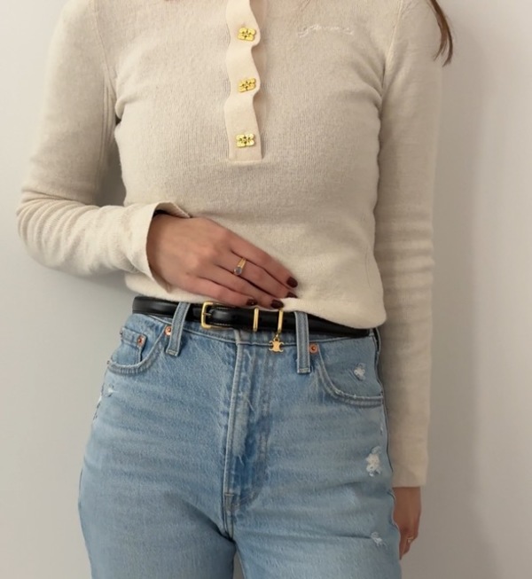 さりげないトリオンフチャームが上品なゆらめきで、スカートやパンツとも合わせやすい汎用性の高さを併せ持ちます。こちらのエレガントチャームベルトは日本公式でも未掲載なアイテムなため、周りと差をつけられるまさに知る人ぞ知るおしゃれアイテムなんです!