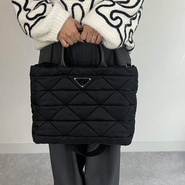 PRADA(プラダ)で大人気なキルティングナイロントートは、13インチのPCがすっぽり入る大容量サイズ。ナイロンを使ったふかふかとした素材だから、軽いのに存在感も◎トライアングルロゴとキルティングがアクセントになっています。