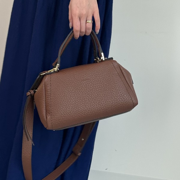 ∟LORISTELLA(ロリステッラ)のレザーショルダーバッグは、シボ感のあるお値段以上の高見えアイテム。ハンドル部分が短めなので、付属のショルダーストラップで斜め掛けすると、厚手のアウターの上からでも持ちやすいです。