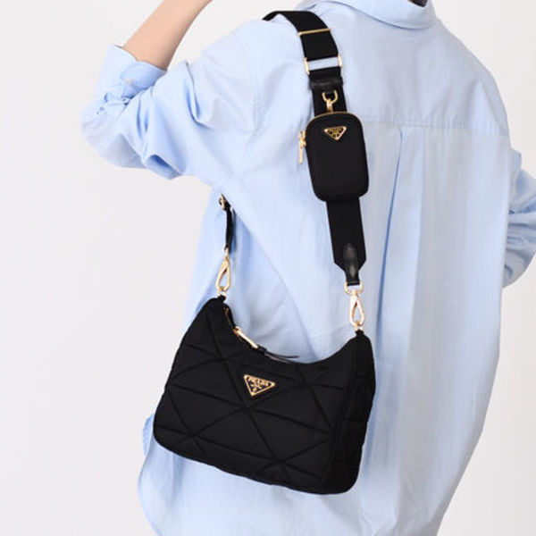 ∟PRADA(プラダ)の「リナイロン」シリーズは、スタイリッシュなトライアングルロゴが光る大人気定番バッグ。長さ調節可能なショルダーストラップは、太めなので重めの長財布を入れてもストレスフリー。付属のポーチには、イヤホンやリップなどを収納できます。