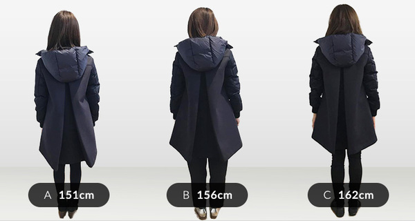 前からのシルエットでチェックしたいのは、フロントのファスナー・チャックを閉めたときの印象と着丈。フロントのファスナー・チャックは3人ともしっかり閉めることができました。今回は全員なかに薄手のカットソーを着ていてちょうどいい印象でした。体型にもよりますが、バストや身幅がある人や、中に厚手のニットやセーター、裏起毛が付いた厚みのあるスウェットだと窮屈に感じる方もいるかもしれません。また着丈は、身長150cm~156cm前後の女性であれば、膝がすっぽり隠れるか膝上すれすれの長さ。160cm以上になると膝が完全に出る着丈になります。
