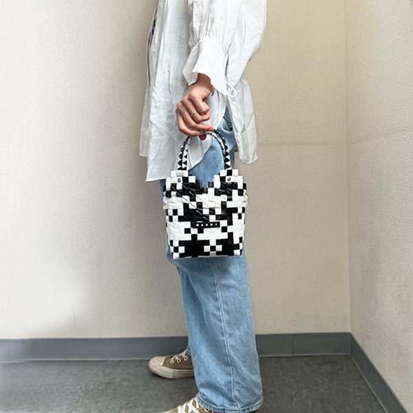 テックウール素材で「マルニマーケット」らしく、レディライクさとカジュアルさを兼ね備えたトップハンドルバッグ♡パキッとインパクトのある配色のチェック柄モチーフがベーシックなスタイリングを格上げします。