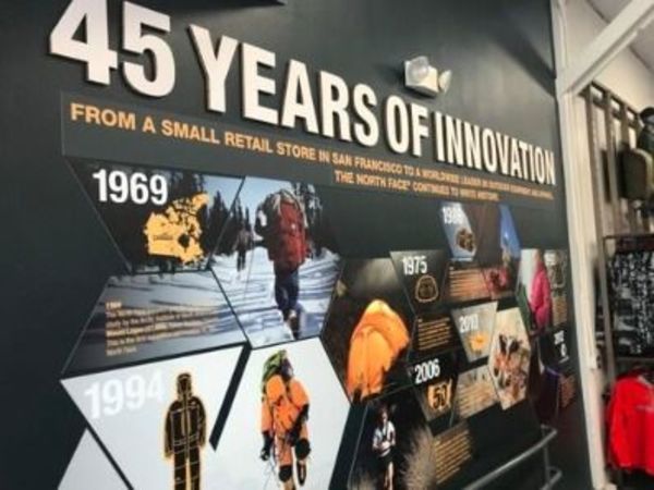 早速入り口の側面に顔を出したのはブランド設立から今までのイノベーションの歴史!!1968年にサンフランシスコで創設されて以来、最初は小さな店舗からはじまり、50年の時を超えて、今では世界を代表するアウトドアブランドになったと書かれています。